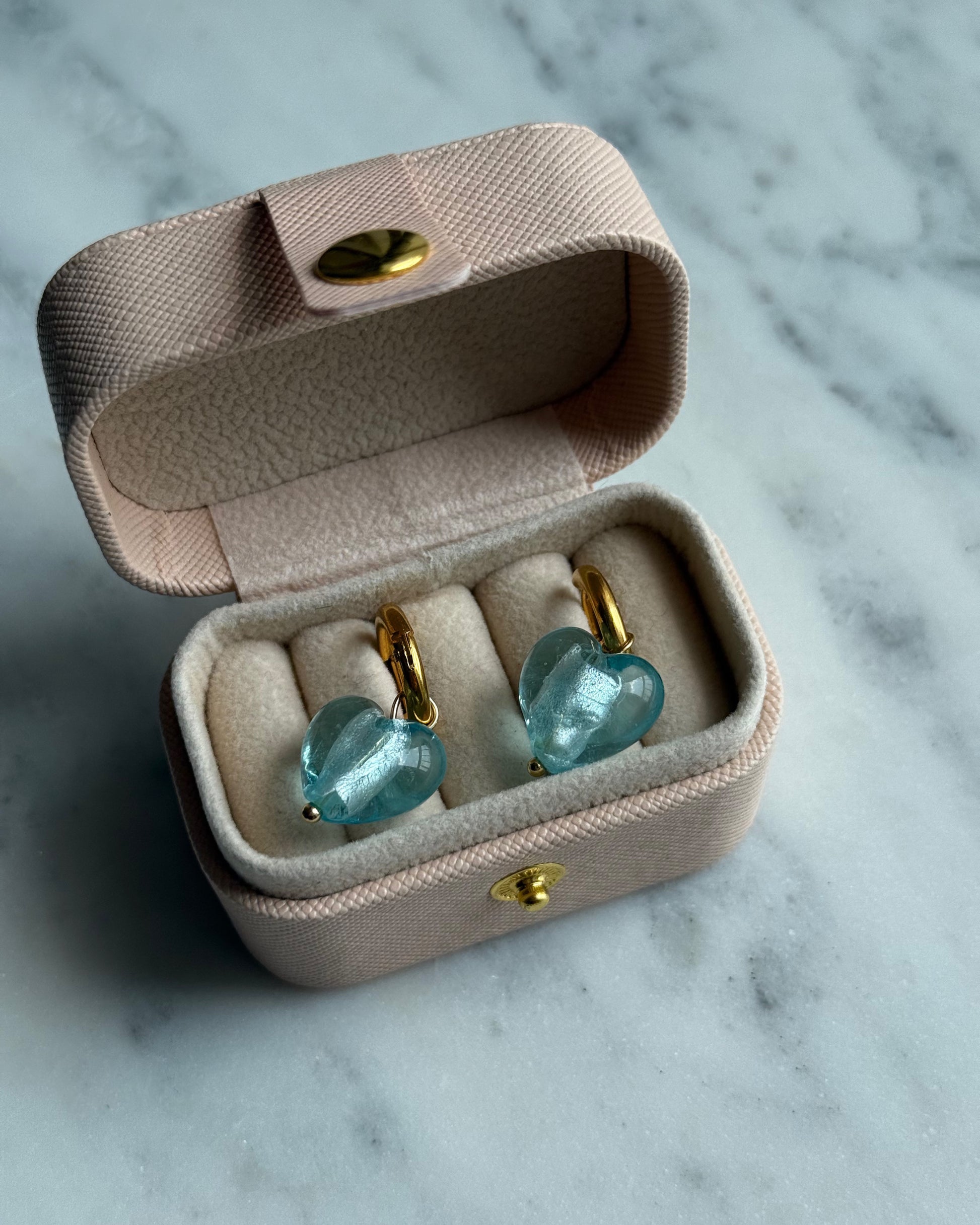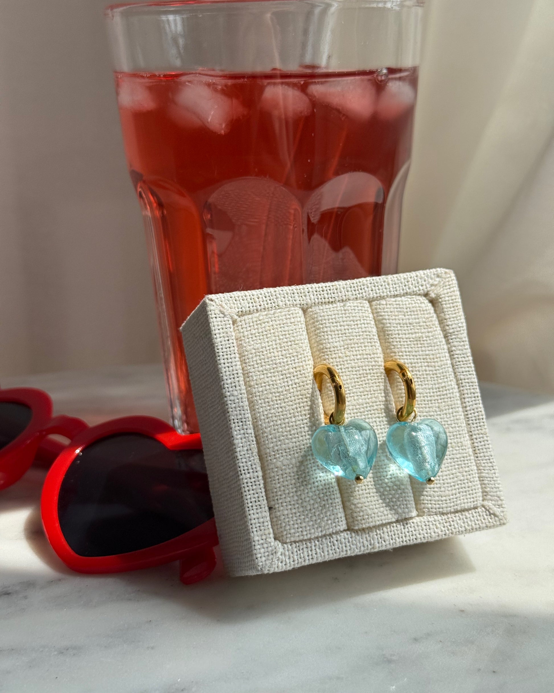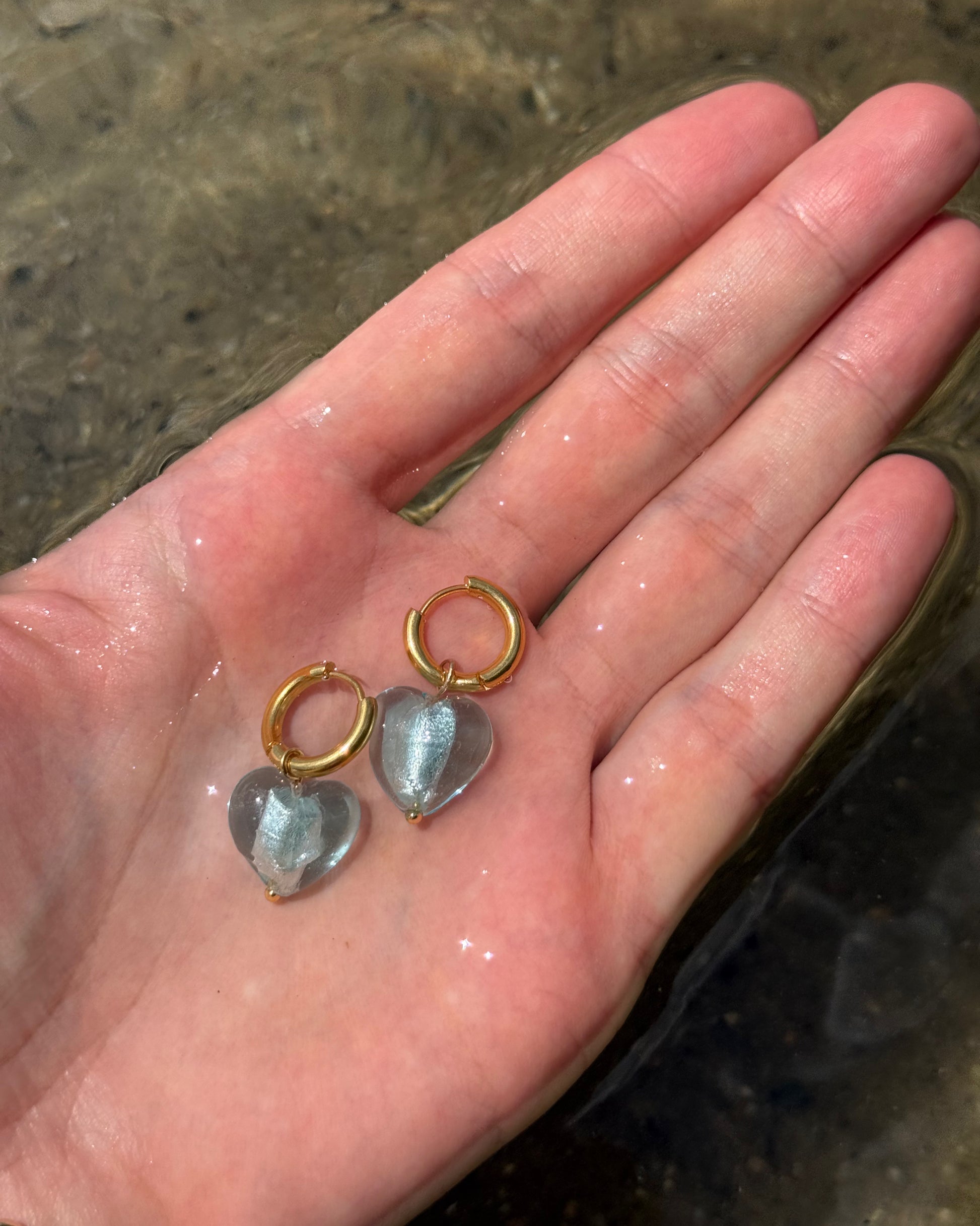 Die Glasherzen in klarem Hellblau funkeln mit nostalgischem Charme und die 24k vergoldeten Creolen setzen einen ausdrucksstarken Akzent. Diese herzförmigen Ohrringe sind gemacht für Tagträume bei Sonnenuntergang und nächtliches Schwimmen im Meer.