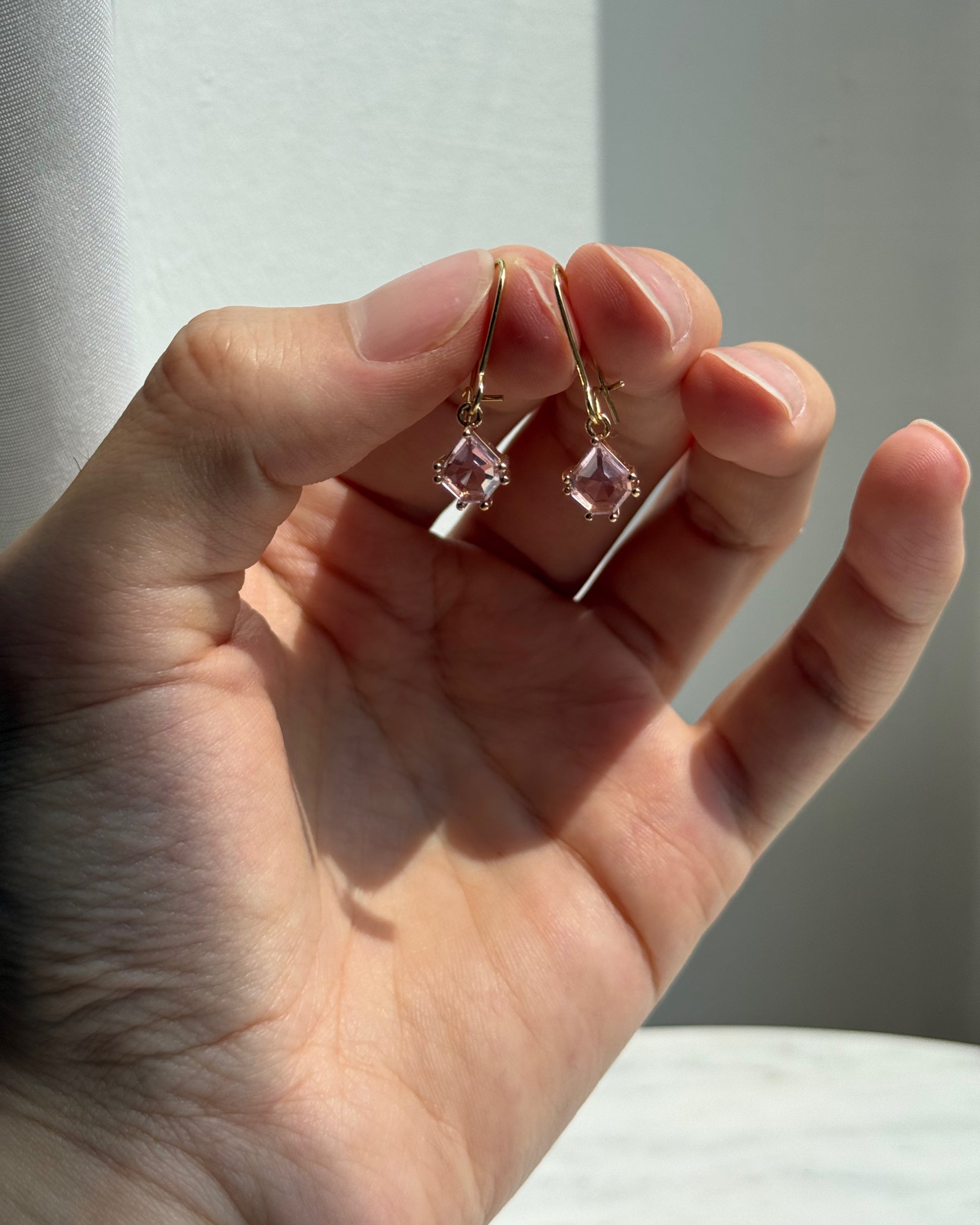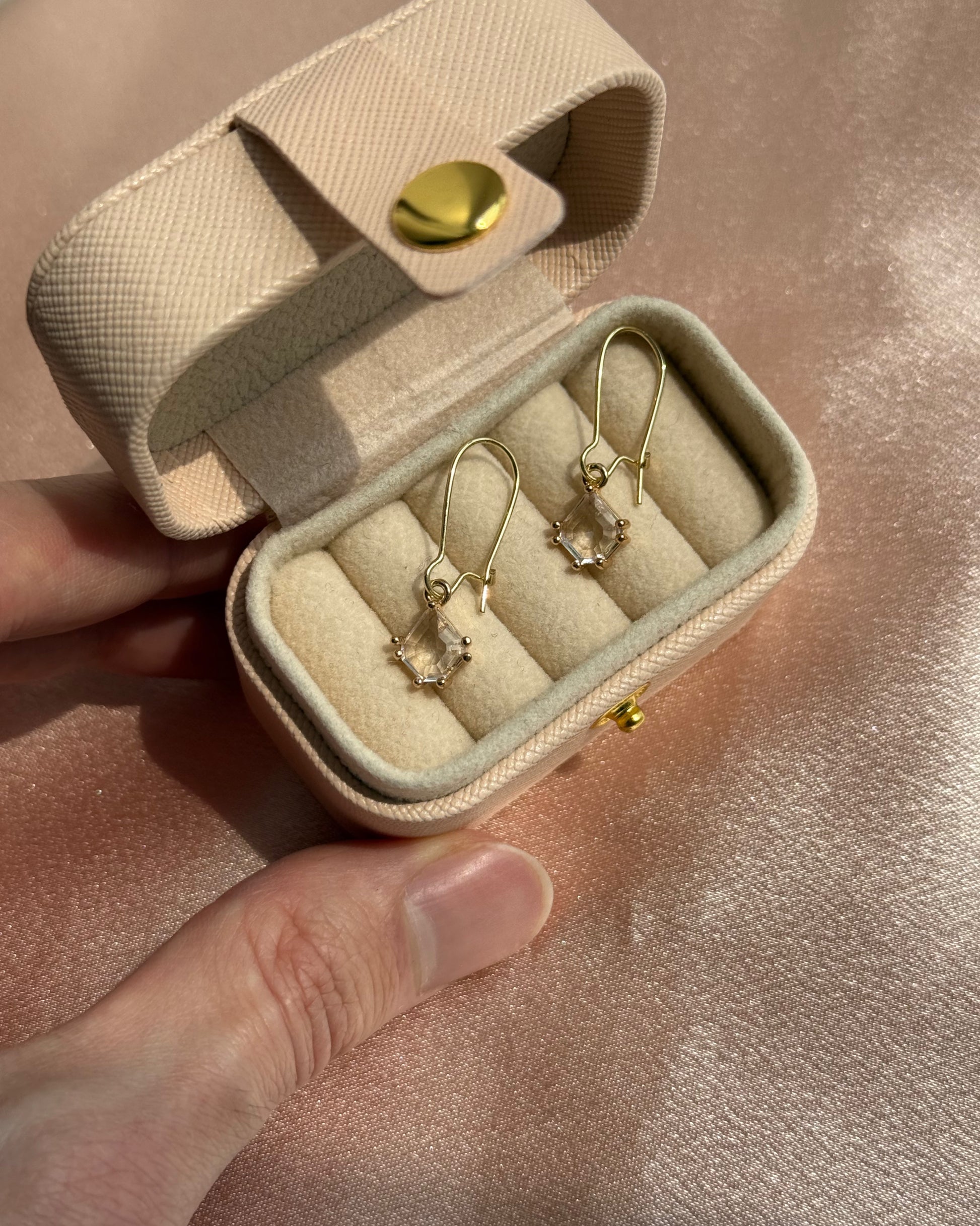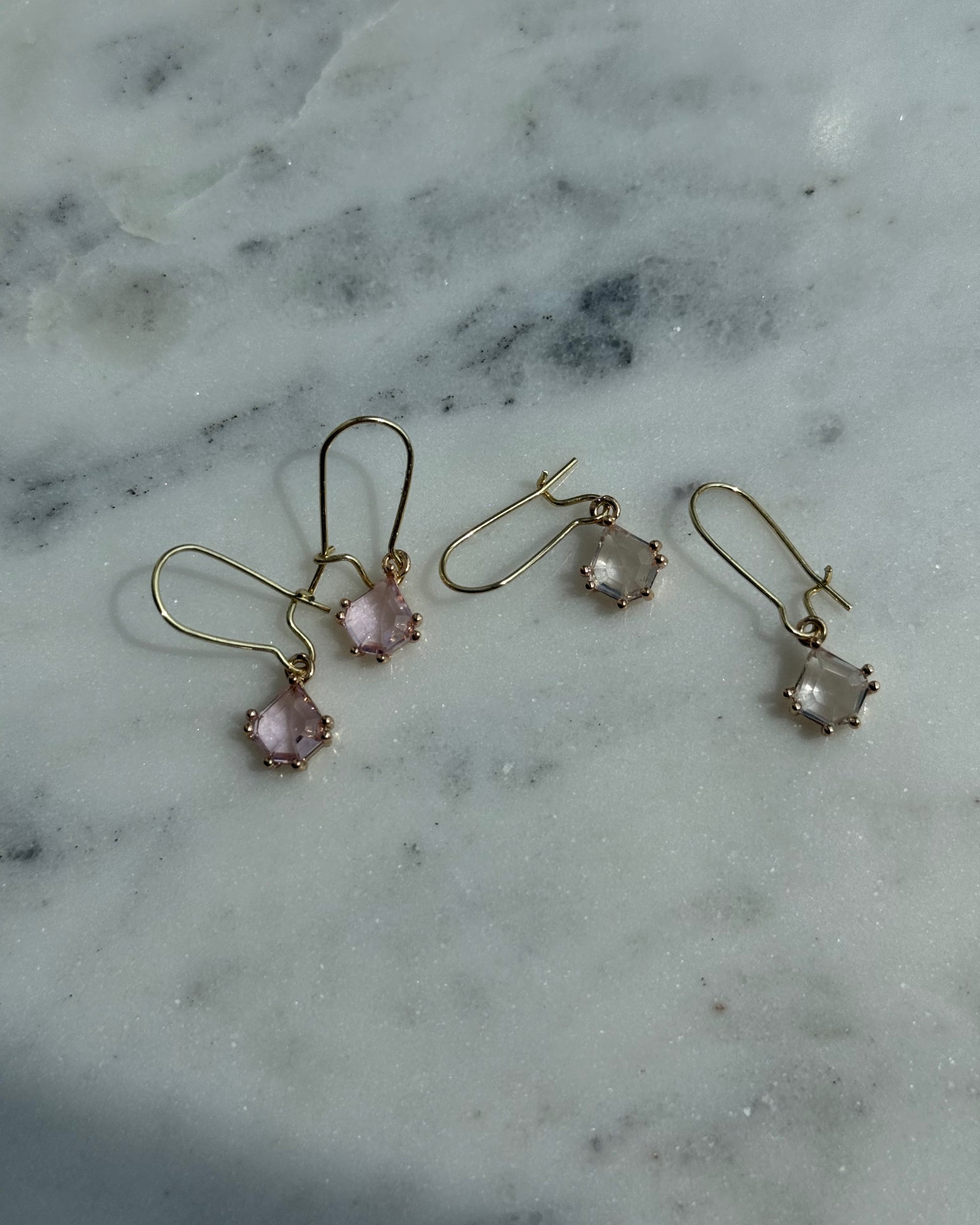 Die fein geschliffenen, polygonförmigen Charms reflektieren das Licht bei jeder Bewegung. Getragen an eleganten, 18k gold filled Hoops sind sie angenehm leicht, aber voller Ausstrahlung – ein Schmuckstück für alle, die es weich und gleichzeitig selbstbewusst mögen.